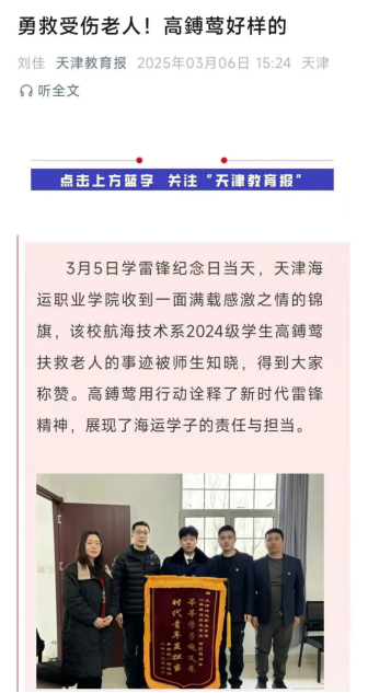 3月6日,天津教育報(bào)微信公眾號(hào)發(fā)表文章《勇救受傷老人!高鎛鶯好樣的》,報(bào)道了天津海運(yùn)職業(yè)學(xué)院航海技術(shù)系2024級(jí)學(xué)生高鎛鶯扶救老人的事跡。緊急時(shí)刻顯擔(dān)當(dāng),勇敢救助受傷老人,高鎛鶯好樣的! 3月1日早上7點(diǎn)左右,高鎛鶯在中海月壇附近騎行,看到一位老奶奶摔倒在地,老人頭部受傷大量出血,考慮到老人的生命安全,雖然害怕,但高鎛鶯依然果斷下車,將老人扶到路邊,用口袋中的紙巾幫助老人處理傷口,迅速與老人的子女取得聯(lián)系,在看到老人被平安送往醫(yī)院后,高鎛鶯才默默離開。