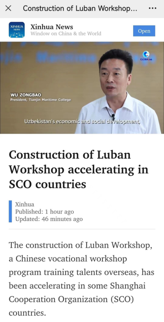 2022年9月15日、16日,新華社分別發表文章《魯班工坊:走向世界的中國職教名片》和《Construction of Luban Workshop accelerating in SCO countries》,介紹了天津海運職業學院與烏茲別克斯坦塔什干國立交通大學共建魯班工坊情況。