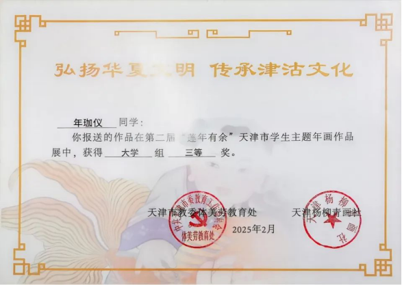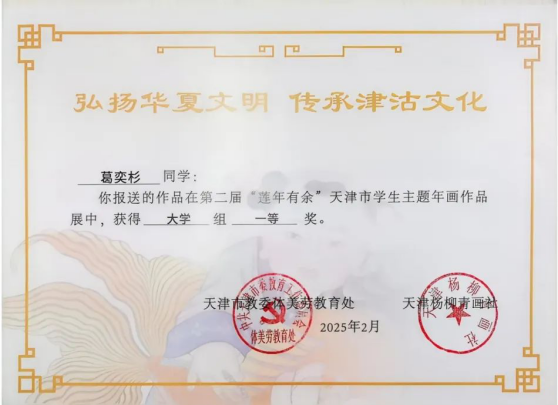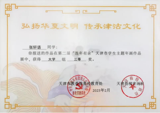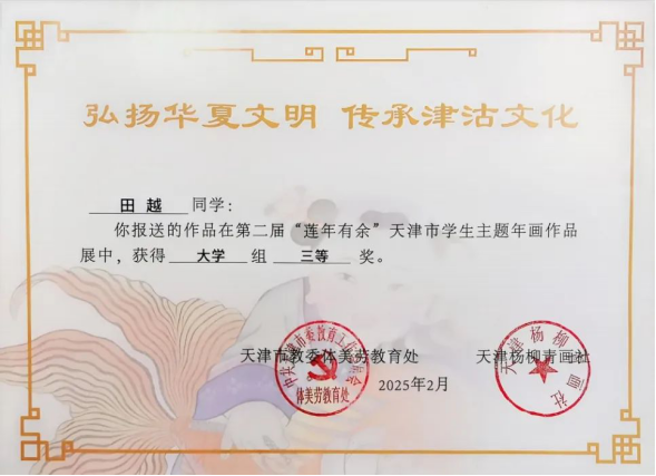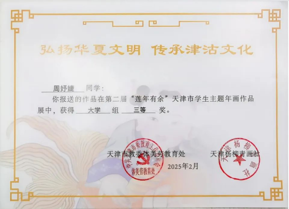 近日,由天津市教育委員會(huì)與楊柳青年畫社聯(lián)合舉辦的“蓮年有余”天津市學(xué)生主題年畫作品展落下帷幕。此次活動(dòng)中共收到來自16個(gè)區(qū)的598所中小學(xué)、38所高校報(bào)送的9068件作品,經(jīng)專家評(píng)選,海運(yùn)學(xué)子憑借對(duì)傳統(tǒng)年畫藝術(shù)的深刻理解和獨(dú)特創(chuàng)新,最終5件作品入圍并獲得1個(gè)一等獎(jiǎng)、4個(gè)三等獎(jiǎng),展現(xiàn)了同學(xué)們對(duì)傳統(tǒng)文化的熱愛和勇于探索創(chuàng)新的精神風(fēng)貌。