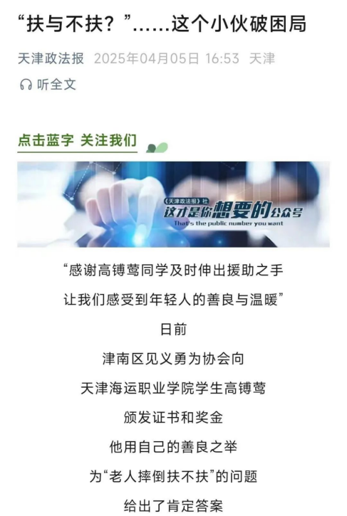 4月5日,天津政法報微信公眾號發(fā)表文章《“扶與不扶?”……這個小伙破困局》,報道天津海運(yùn)職業(yè)學(xué)院航海技術(shù)系高鎛鶯同學(xué)勇敢救助受傷老人。