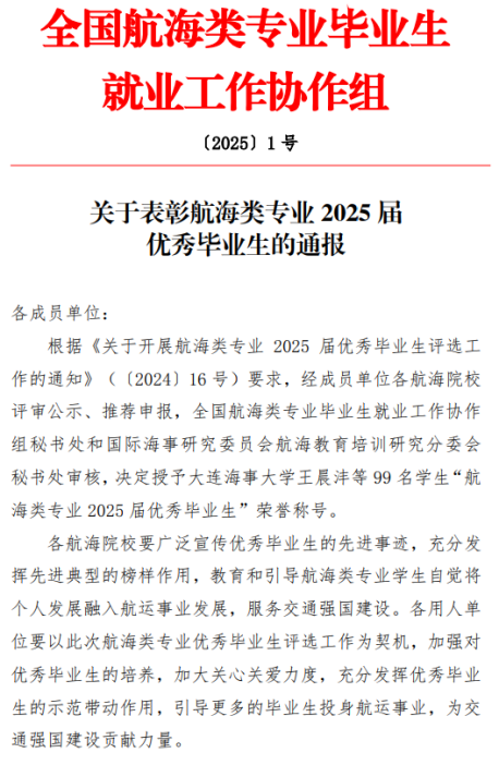 在全國航海類專業畢業生就業工作協作組開展的2025屆全國航海類專業優秀畢業生評選活動中,來自全國航海類本科院校55人、高職院校44人,共計99名優秀畢業生獲得表彰。天津海運職業學院航海技術專業柏子琦、閆晨旭、趙攀、程泳豪、韓旭陽、王子騰、王家露等7名同學和輪機工程技術專業朱帥杰同學榮獲“2025屆全國航海類專業優秀畢業生”稱號。