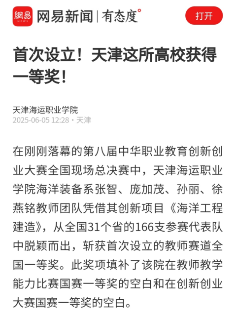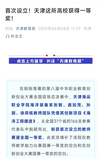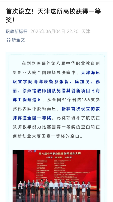 在剛剛落幕的第八屆中華職業(yè)教育創(chuàng)新創(chuàng)業(yè)大賽全國現(xiàn)場總決賽中,天津海運職業(yè)學院海洋裝備系張智、龐加茂、孫麗、徐燕銘教師團隊憑借其創(chuàng)新項目《海洋工程建造》,從全國31個省的166支參賽代表隊中脫穎而出,斬獲首次設立的教師賽道全國一等獎。此獎項填補了該院在教師教學能力比賽國賽一等獎的空白和在創(chuàng)新創(chuàng)業(yè)大賽國賽一等獎的空白。