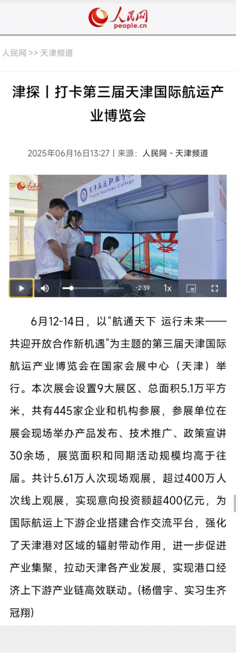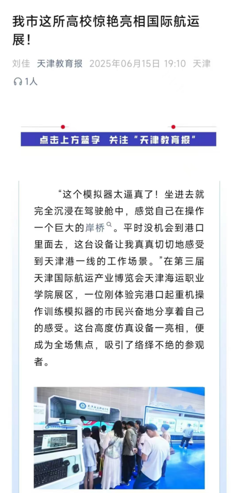 第三屆國際航運展期間,天津海運職業學院展區展出的港口起吊機訓練模擬器驚艷亮相,成為全場焦點,吸引了絡繹不絕的參觀者。人民網、央視新聞、天津教育報、職教新標桿等媒體平臺對此進行了關注報道。