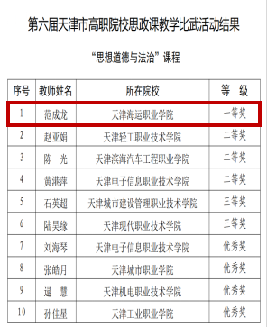 近日,市教育兩委公布了第六屆天津市高職院校思政課教學比武活動結果,經初賽選拔、復賽專家匿名評審和決賽現場教學展示,思政課教師范成龍榮獲“思想道德與法治”課程組一等獎。