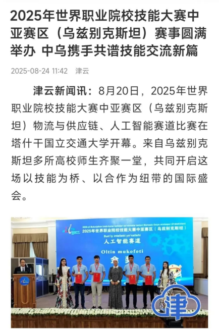 8月20日,2025年世界職業(yè)院校技能大賽中亞賽區(qū)(烏茲別克斯坦)物流與供應鏈、人工智能賽道比賽在塔什干國立交通大學開幕。津云發(fā)表文章《2025年世界職業(yè)院校技能大賽中亞賽區(qū)(烏茲別克斯坦)賽事圓滿舉辦 中烏攜手共譜技能交流新篇》,對大賽進行了報道。