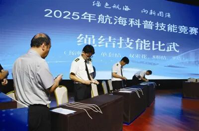 海上航行技術人員的繩結技藝堪稱他們的“看家本領”,不同的繩結有不同的作用。近日,在天津海運職業學院進行的“2025年航海科普技能競賽”賽場上,選手們用規范又巧妙地打繩結技巧,將比賽推向高潮。