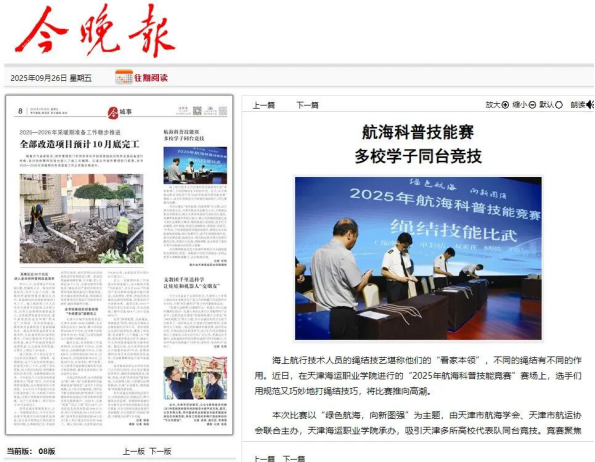 9月26日,《今晚報》刊發文章《航海科普技能賽 多校學子同臺競技》,報道2025年航海科普技能競賽在天津海運職業學院圓滿舉辦。本次競賽由天津市航海學會、天津市航運協會聯合主辦,天津海運職業學院承辦,吸引了來自天津各高校的六支代表隊同臺競技。