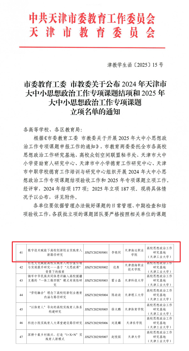 日前,市教育兩委公布2025年大中小思想政治工作專項課題立項名單,海洋工程裝備系李曉同老師主持申報的課題《數字技術賦能下高校創新創業實踐育人新路徑研究》獲批2025年天津市高校思想政治工作課題立項。