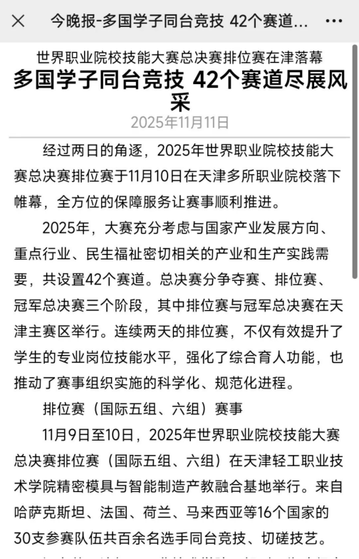 11月11日,《今晚報》刊發文章《世界職業院校技能大賽總決賽排位賽在津落幕 多國學子同臺競技42個賽道盡展風采》,報道2025年世界職業院校技能大賽總決賽排位賽高職三組賽事在天津海運職業學院舉行。