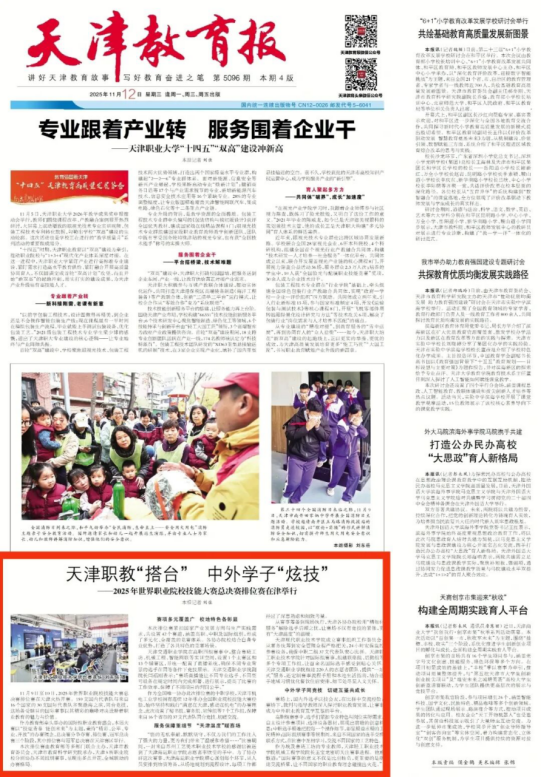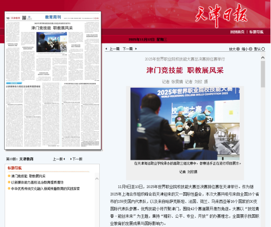 11月12日,《天津日?qǐng)?bào)》《天津教育報(bào)》分別刊發(fā)文章《2025年世界職業(yè)院校技能大賽總決賽排位賽舉行津門(mén)競(jìng)技能 職教展風(fēng)采》和《天津職教“搭臺(tái)” 中外學(xué)子“炫技”——2025年世界職業(yè)院校技能大賽總決賽排位賽在津舉行》,報(bào)道2025年世界職業(yè)院校技能大賽總決賽排位賽高職三組賽事在天津海運(yùn)職業(yè)學(xué)院舉行。