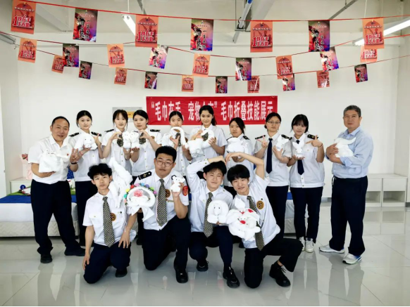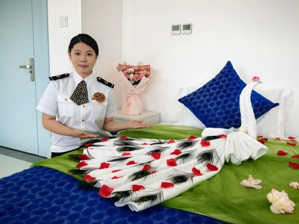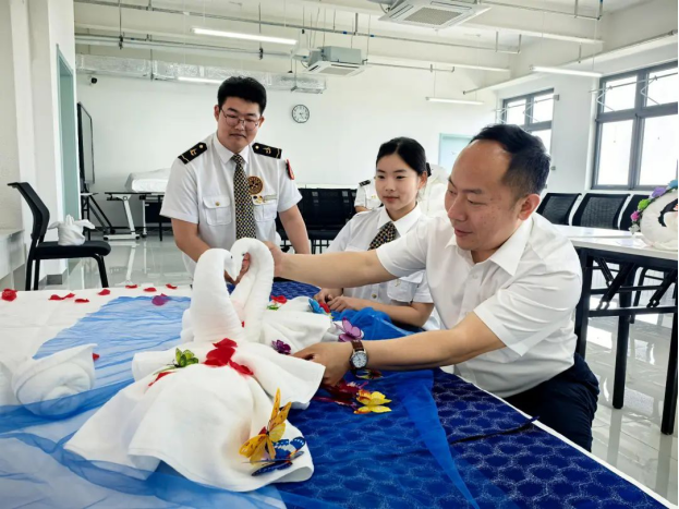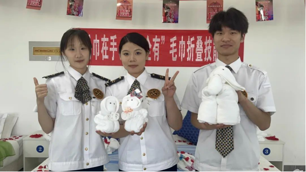 “為游客準備精美的毛巾寵物是郵輪客艙服務的國際慣例,這絕非簡單的服務技能,而是一門獨特的藝術創(chuàng)作”,中國酒店服務大師、中國金鑰匙天津地區(qū)秘書長、郵輪旅游系酒店管理專業(yè)帶頭人胡順利老師介紹道,“每一件作品都經過了精心設計,不僅要確保結構的穩(wěn)定性,更要精準地呈現動物的神態(tài)特征。學生們在沉浸式創(chuàng)作實踐中,不但可以鍛煉空間想象力與動手能力,還能夠培養(yǎng)對自然美學的感知能力。”通過這種方式,勞動教育、美育教育等也有機地融入技能訓練之中,實現了學生綜合素養(yǎng)和技能水準的全面提升。