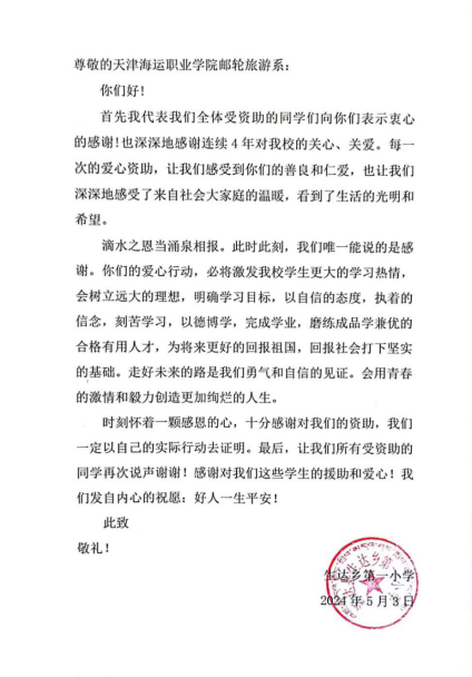 年復一年的涓滴匯聚,早已超越了單純的物質饋贈。它生動詮釋了郵輪旅游系立德樹人、服務社會的深厚情懷,是學院資助育人工作最溫暖、最持久的注腳。這份源自校園、播撒高原的深情厚誼,在孩子們心中種下了感恩與奮進的種子,也在師生心中刻下了責任與擔當的印記。它架起了一座無形的橋梁,連接著內地與高原,傳遞著知識、希望與民族團結的深情,默默滋養著祖國的未來,溫暖了千里之外的雪域求學路。