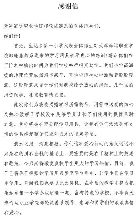 寒來暑往,五載春秋。一份源自郵輪旅游系全體師生的深情牽掛,跨越三千公里的壯闊山河,飛越四千米海拔的巍巍雪域,年復一年,精準抵達西藏昌都孩子們的手中。這,是郵輪旅游系師生心系高原教育、情牽藏族學子的動人篇章——我們連續五年,堅持不懈地為昌都地區生達鄉第一小學的學生捐贈書包、文具、書籍等文化學習用品,這些文具不僅解決了課堂教學的燃眉之急,更是激勵一批又一批西部孩子們的求學之心。孩子們說,他們會努力學習、傳遞愛心、回饋社會。