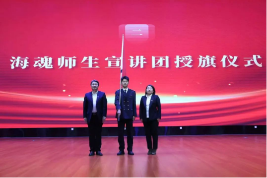 此次活動由思政教學部、黨委學生工作部(學生處、人民武裝部)聯合承辦,學院黨委書記陳昀、院長于忠武、黨委副書記王軍、副院長王明春與全體思政課教師、輔導員及500余名學生代表參加活動。陳昀書記為海魂師生宣講團代表授旗。