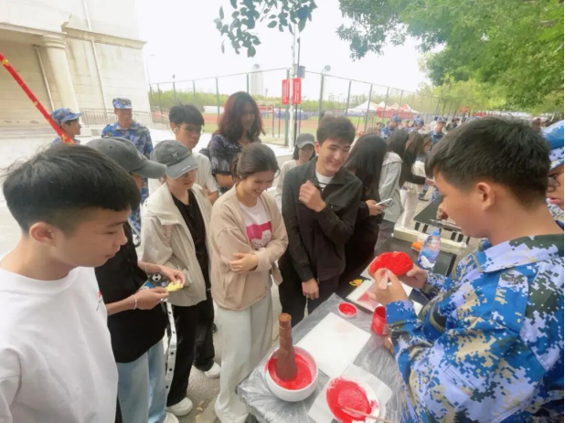 在非遺展示體驗區,楊柳青木版年畫、泥人張彩塑、田氏船模、無同竹編、溫派面塑、于氏掐絲琺瑯釉彩畫、寧氏漆藝鑲嵌漆器、麥秸畫、模具彩塑、傳統刻瓷等展位瞬間被大一新生們“包圍”。非遺傳承人現場展示非遺技藝,講解項目傳承歷史,為學生們獻上獨特的美育“開學第一課”?;顒蝇F場,同學們打卡非遺市集,近距離感受中華優秀傳統文化的獨特魅力。非遺美育的沉浸體驗與“五育融合”的迷彩軍營相向而行,讓青年學子在美美與共中厚植文化自信。學院留學生、聯合培養和田班學生也被吸引而來,紛紛感嘆優秀傳統文化的博大精深。