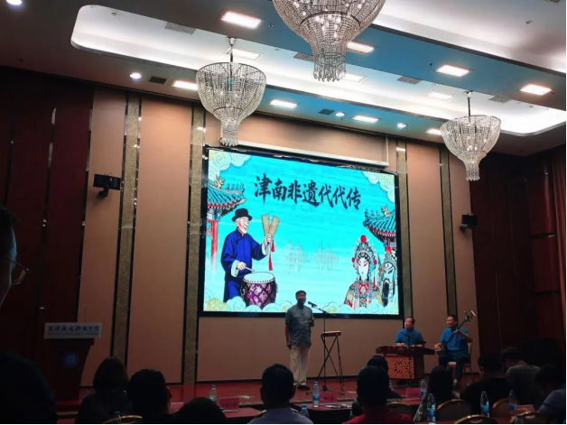 活動邀請了天津科技大學藝術設計學院副院長、非物質文化遺產研究中心和“輕工類產品創意設計”特色學科群負責人張新沂副教授開講《非遺傳承的責任擔當與時代創新》,為在場的師生代表和津南區非遺傳承人分享了非遺傳承的現狀、面臨挑戰、非遺傳承的創新思路。課后展演期間,非遺剪紙服裝走秀節目給大家帶來了一場視覺盛宴,董派京東大鼓傳承人劉炳山登臺獻唱《津南非遺代代傳》,報告廳內一陣陣雷鳴般的掌聲,就是對文化自信最好的詮釋。