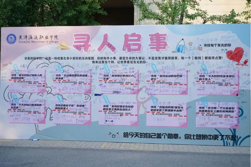 “尋人啟事”簽名墻,鼓勵學(xué)生們化身生活的“記錄官”與“發(fā)現(xiàn)者”,用放大鏡捕捉生命的美好瞬間,在尋找自我的過程中收集溫暖、積攢自信。